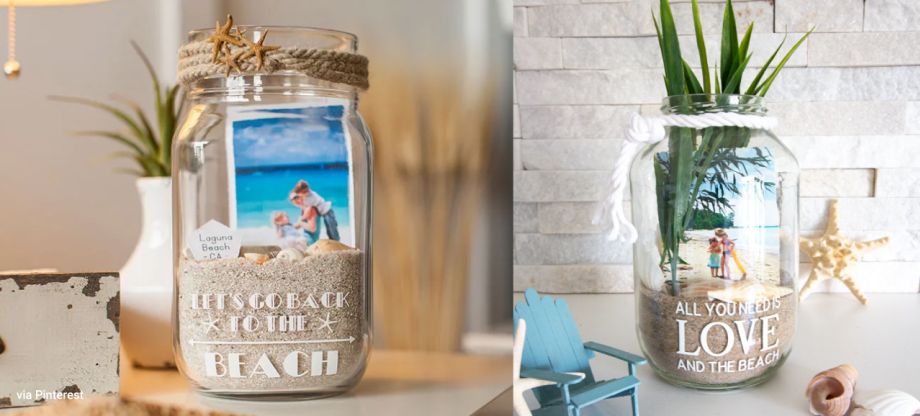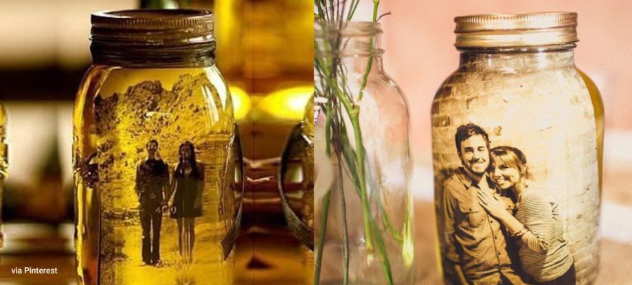 Você pode dar um toque interessante e vintage à sua decoração, com as suas fotos colocando-as em potes de vidro.