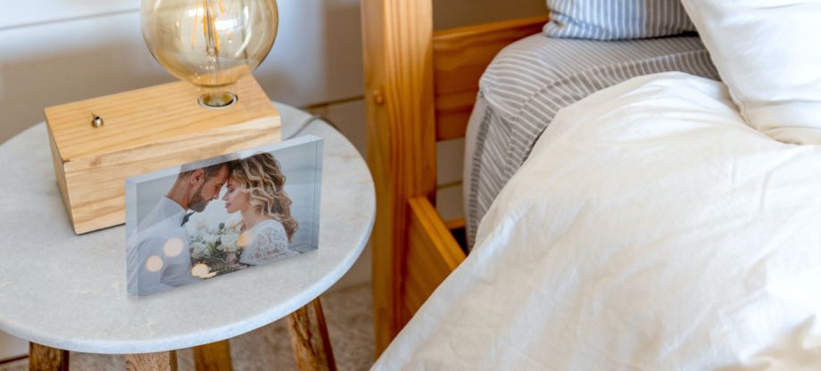 O acrílico extra translúcido de 20mm de espessura, recortado a laser, sem arestas ou rebarbas, resulta em um porta-retratos único com efeito de profundidade 3D.