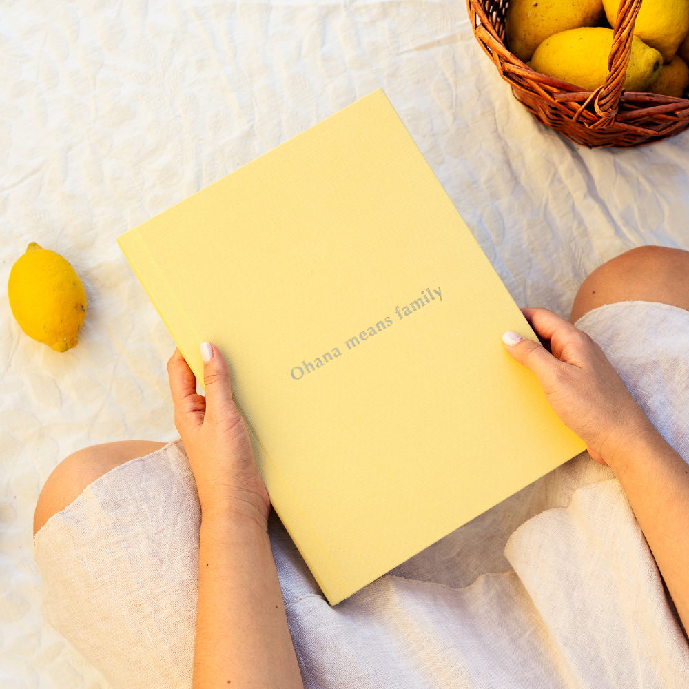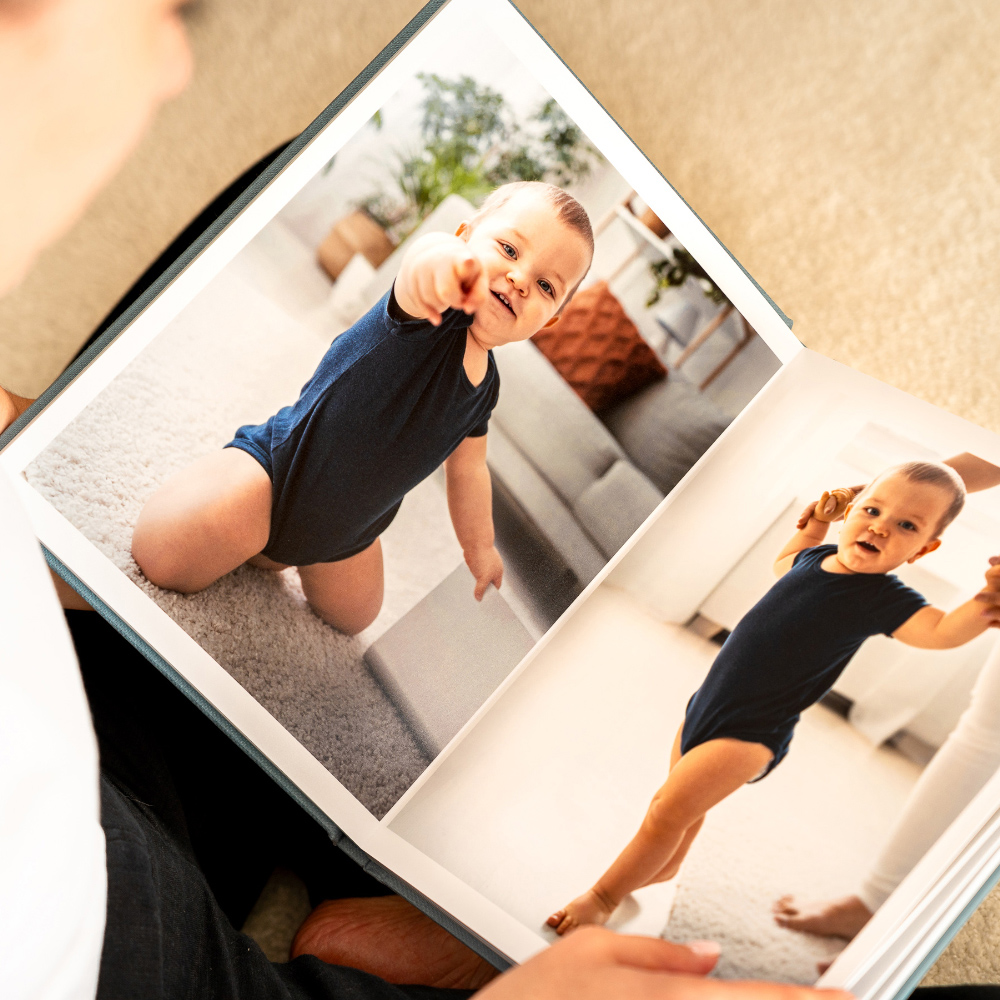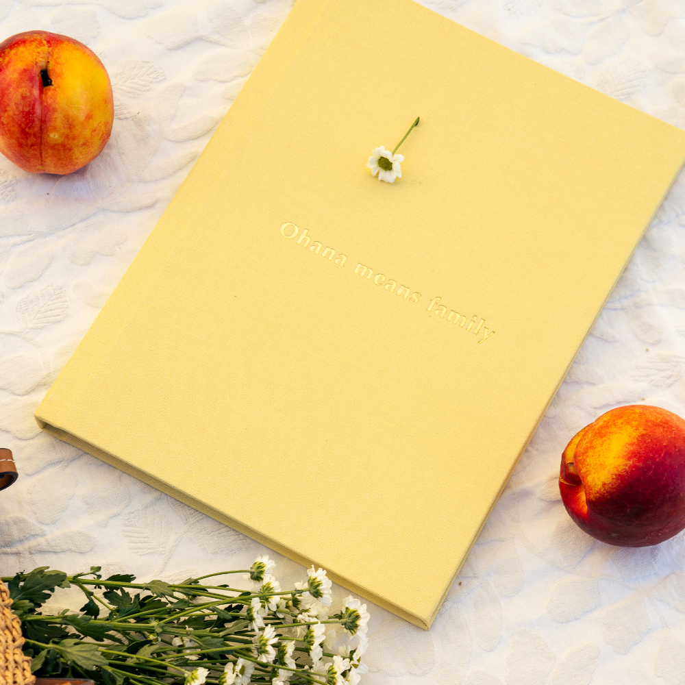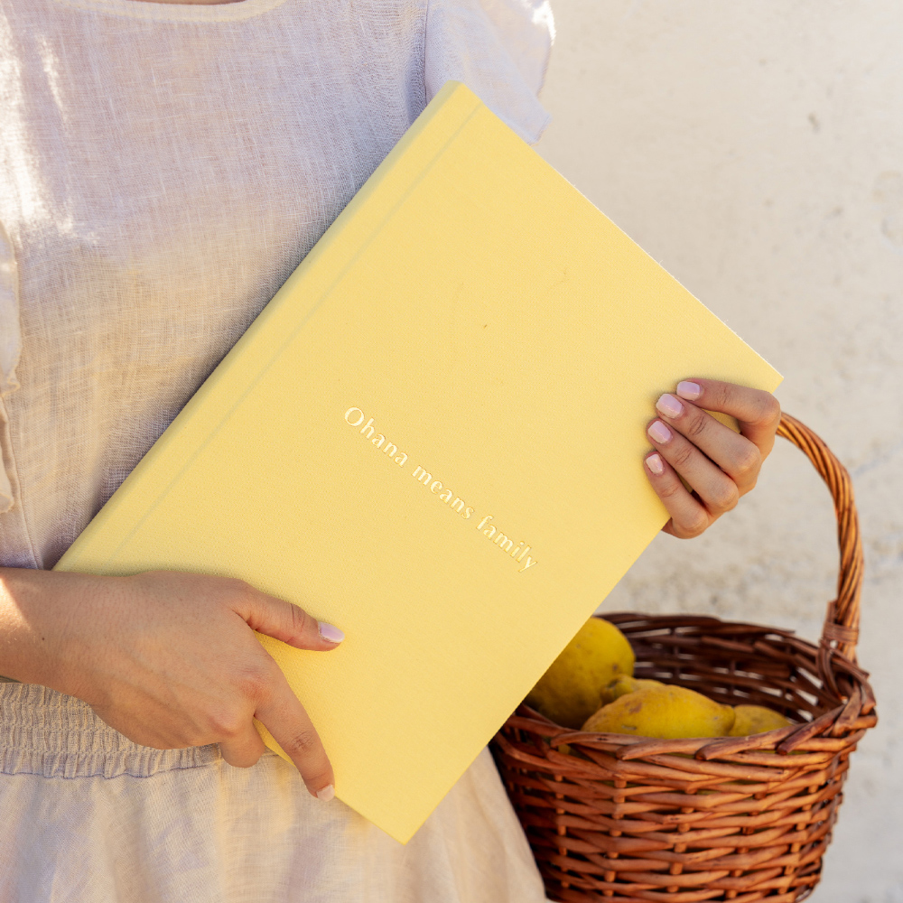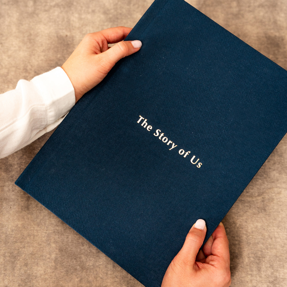 En el modelo Inscription, la portada adquiere una firma propia. La técnica de stamping graba nombres, fechas o pequeñas frases directamente sobre el tejido, creando un relieve sutil y elegante que transforma el álbum en un objeto aún más conectado con la historia que guarda.